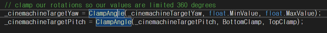 CameraRotation에서 Mouse의 Pointer를 180도이상돌리게되면 -180~0으로 점점 줄어들고, 0 에도달하게되면다시 0~ 180까지 늘어다는 구조이다. 이는 아래와 같이 코드상에서 초기화를 진행해주었기에 부드럽게 화면에 묘사될수있는것이다.