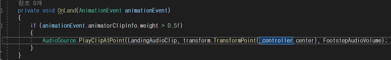 또한 아래의 코드는 Animatior가 아닌, AnimationEvent를 매개로 받아서, 해당 Blend의 값(weight)가 0.5f일때만 오디오클립을 수행하도록 한다.