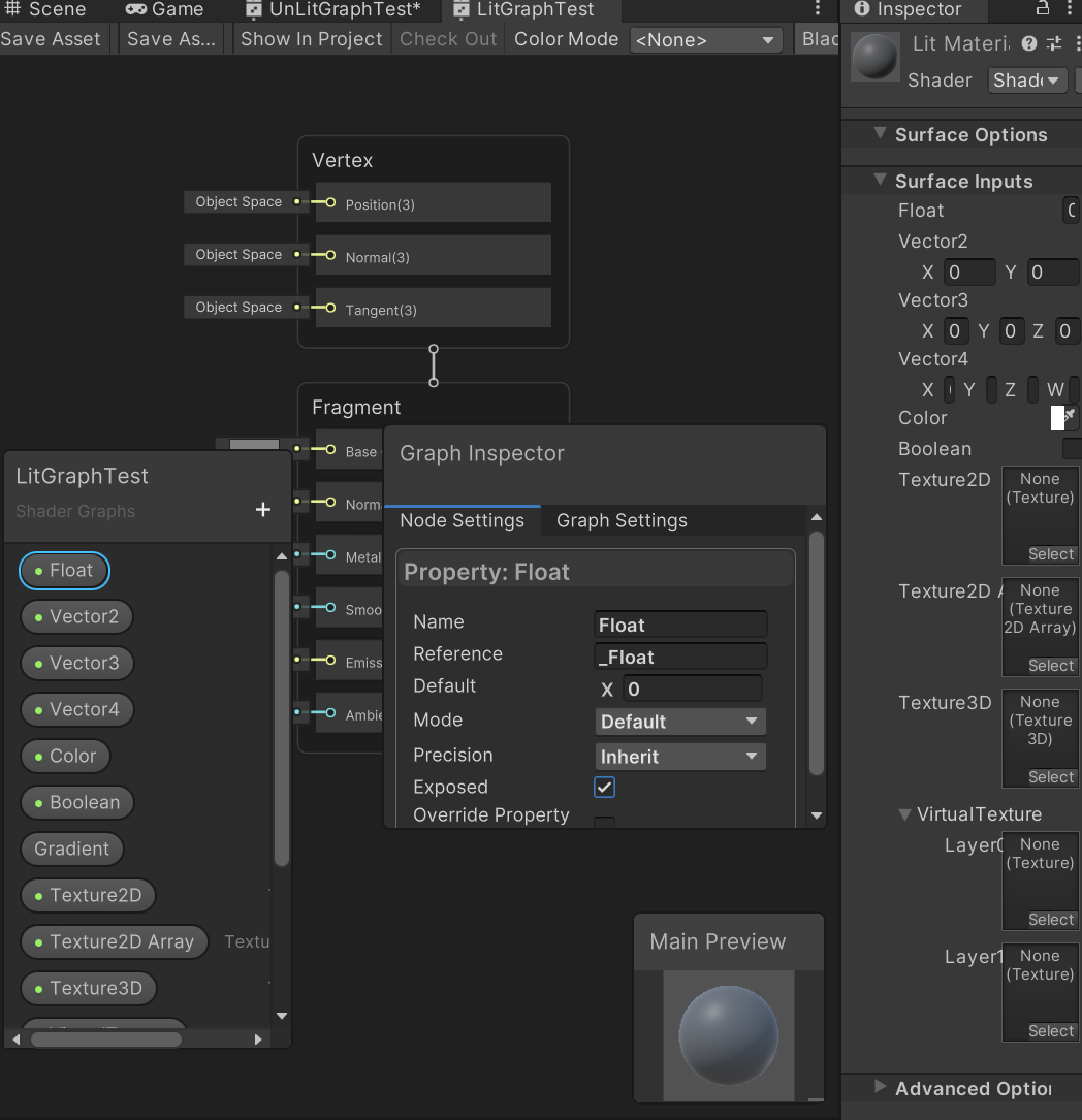 아래와 같이 쉐이더그래프 - 블랙보드에서 다양한 옵션들을 생성하고 이를 인스펙터에서 확인할수도 있다. 이때, Graph Inspector에서 exposed 체크가 되어있는 (불이 들어와있는) 항목들만 확인 가능하며, 체크 해제하고 save 시, 인스펙터상에서 확인할수없다.
