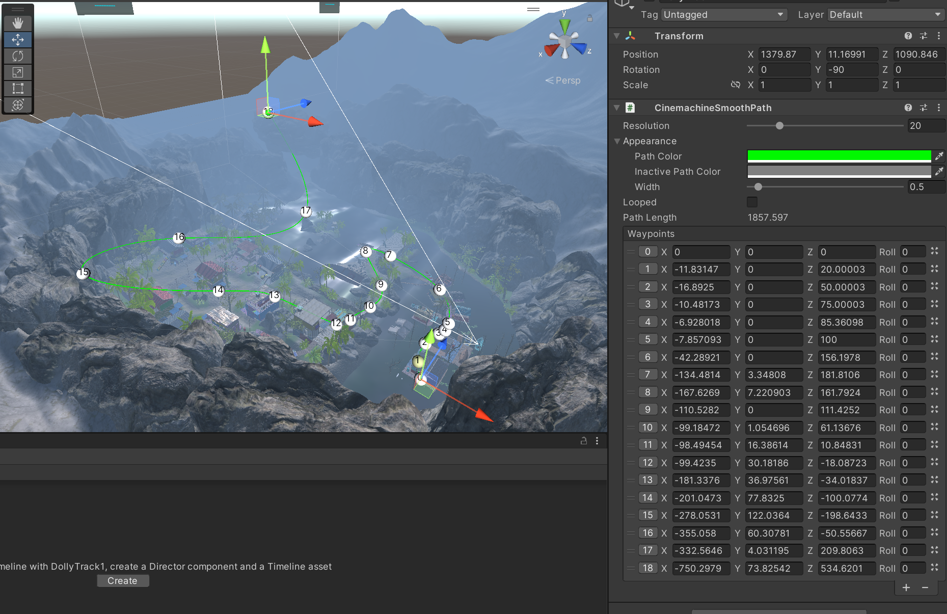 Transitions : 카메라 사이를 이동할 때 씬 전환 효과 설정.