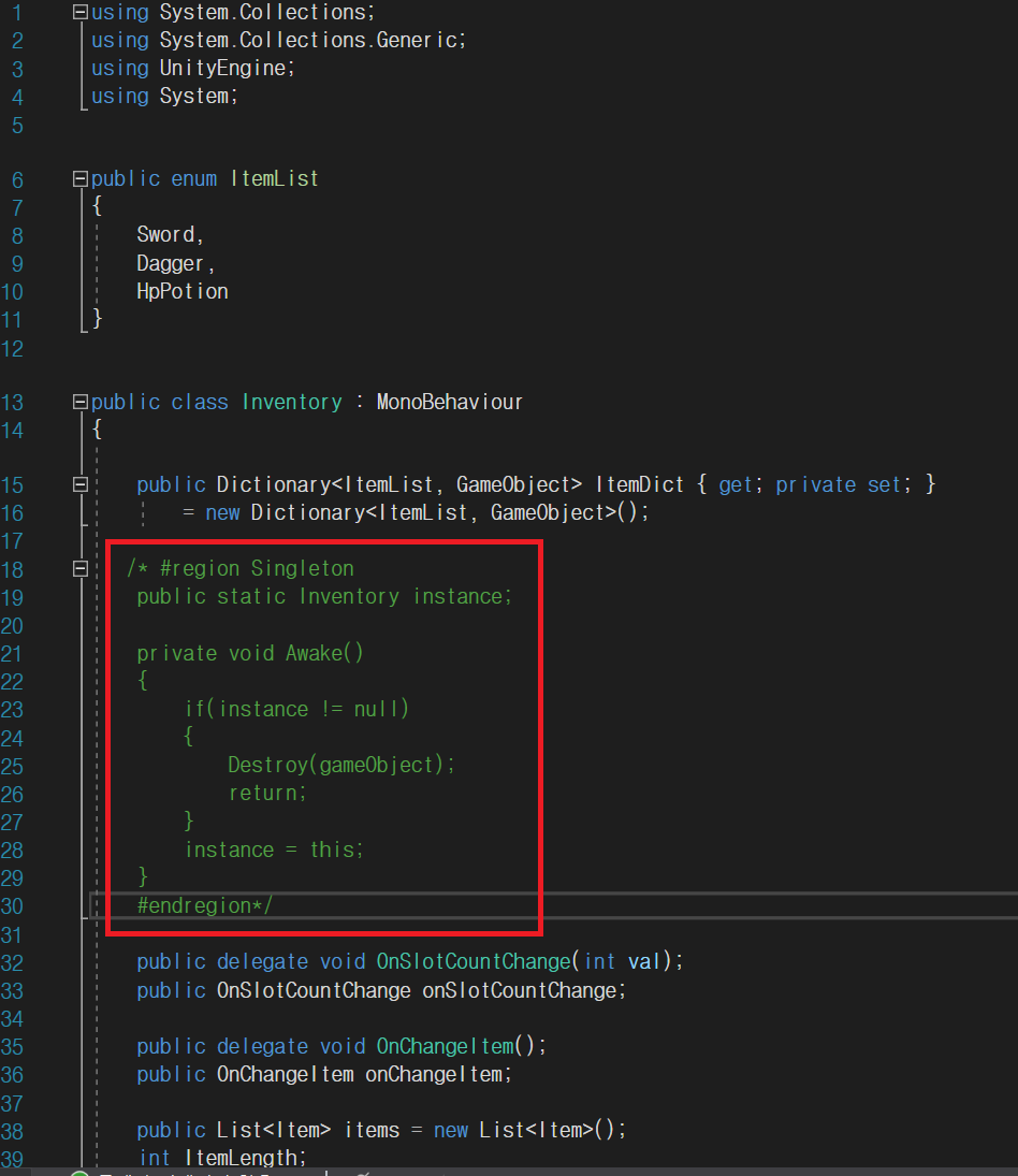 그 결과, 프리팹이 가지고 있는 스크립트 중, 인벤토리관리를 위한 스크립트에서의 싱글톤 코드가 문제라는 점을 파악하였다.