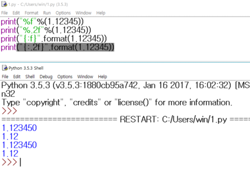 | %.2f | {:.2f} | 소수점 2자리까지 실수값 출력 |