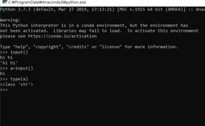 a = input() 함수를 통해 a를 hi 라고 설정하였다면, type함수를 통해서 문자열이라는 사실을확인할수있다.