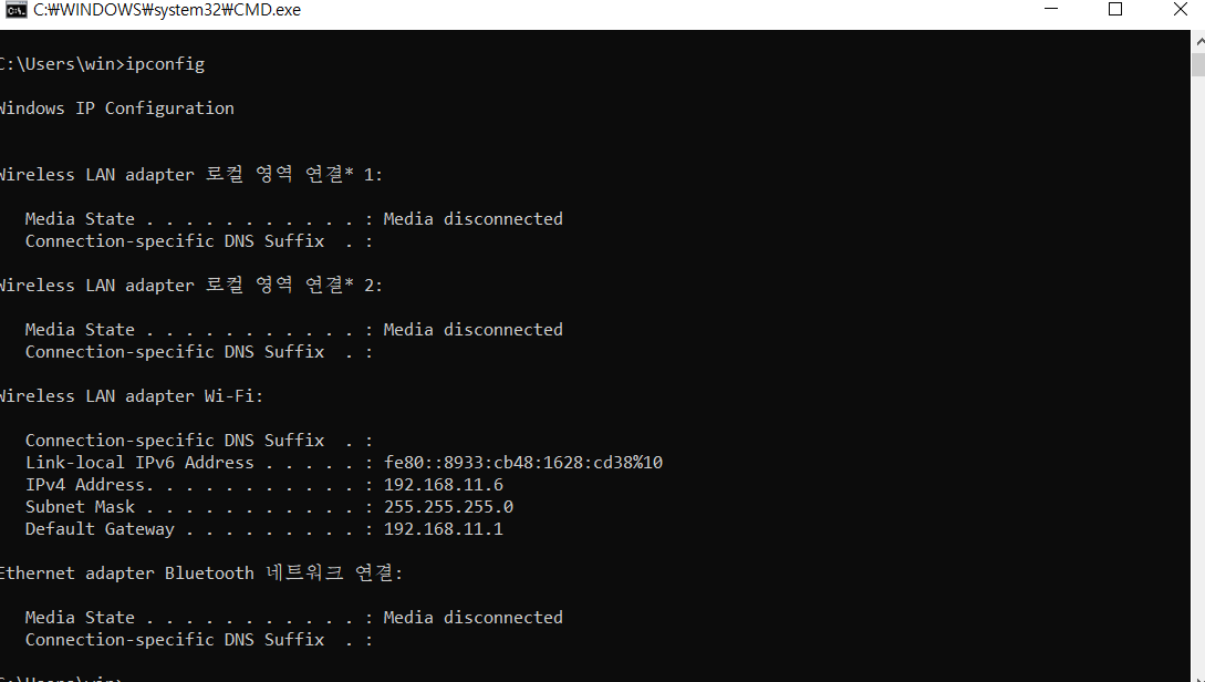 ipconfig 를 입력하였다면, 아래와 같은 화면이 뜰것이다. 여기서 IPv4 Address...... 192.168.11.6 이 현재 작성자의 ip이다.
