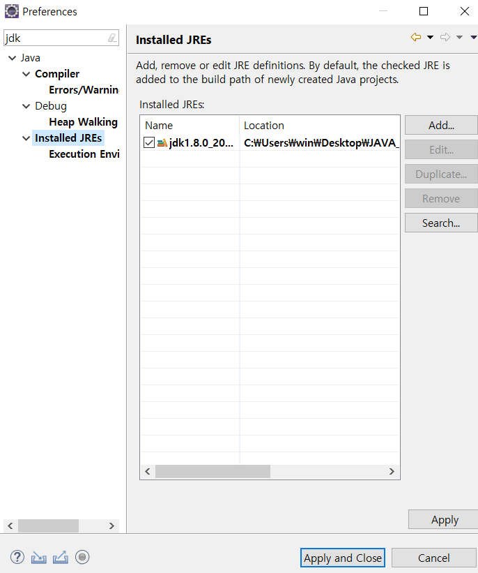 메뉴단의 Windows -> preferences -> jdk검색 -> 아래와 같은 창이뜨면 본인pc내의 jdk 경로로 정확히 설정하기